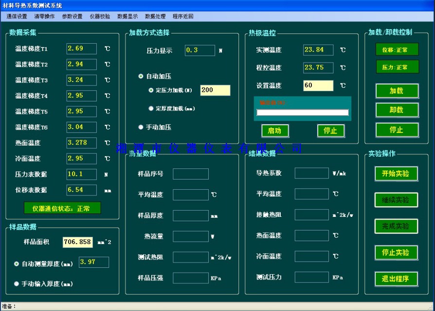 儀器特點:帶自動加壓(配用減速電機、高精度壓力傳感器、調(diào)速器),自動測厚裝置(配用高精度位移傳感器測量),并連計算機實現(xiàn)全自動控制。儀器采用6點溫度梯度檢測,提高了測試精度。可檢測不同壓力下熱阻曲線,采用優(yōu)化的數(shù)學模型,可測量材料導熱系數(shù)和熱阻以及界面處接觸熱阻等多個參數(shù)。